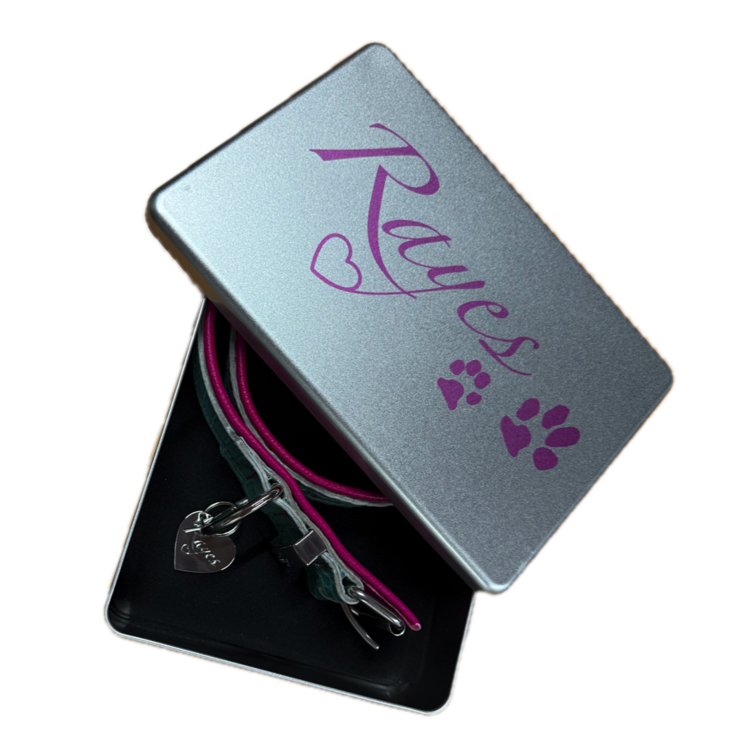 Alle Halsbänder sind auf die Anatomie des Hundes angepasst und weich unterpolstert. Die "schmalen" Halsbänder sind 2.5 cm breit und sind für kleine Hunde oder Hunde mit einem kurzen Hals bis 40 cm Halsumfang geeignet. Die "breiten" Halsbänder sind 4 cm breit und für Grosse Hunde geeignet oder für kleine Hunde mit langem Hals ab einem Halsumfang von 32 cm. Die Anordnung von Ring und Schnalle ist so gewählt, dass die Schnalle bei Zug an der Leine nicht auf den Kehlkopf des Hundes drücken kann. Dies ist bei den meisten Lederhalsbändern, welche heute im kommerziellen Handel erhältlich sind, leider nicht der Fall. Die Schnalle ist bei allen Rayes-Halsbändern unterpolstert, so dass nichts drückt und keine Haare in der Rolle der Schnalle eingeklemmt werden. Für die Herstellung werden nur hochwertige Materialien verwendet.