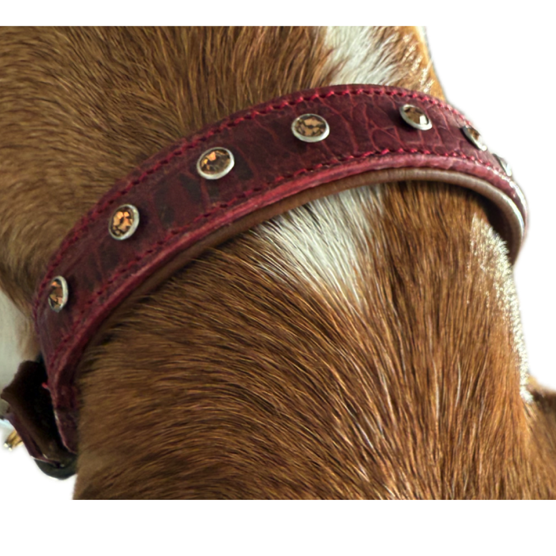 Wähle die Grösse (Halsumfang deines Hundes in cm), die Farbe des Polsters, die Farbe der Beschläge, die Kantenfarbe und die Farbe der Strasssteine aus.
